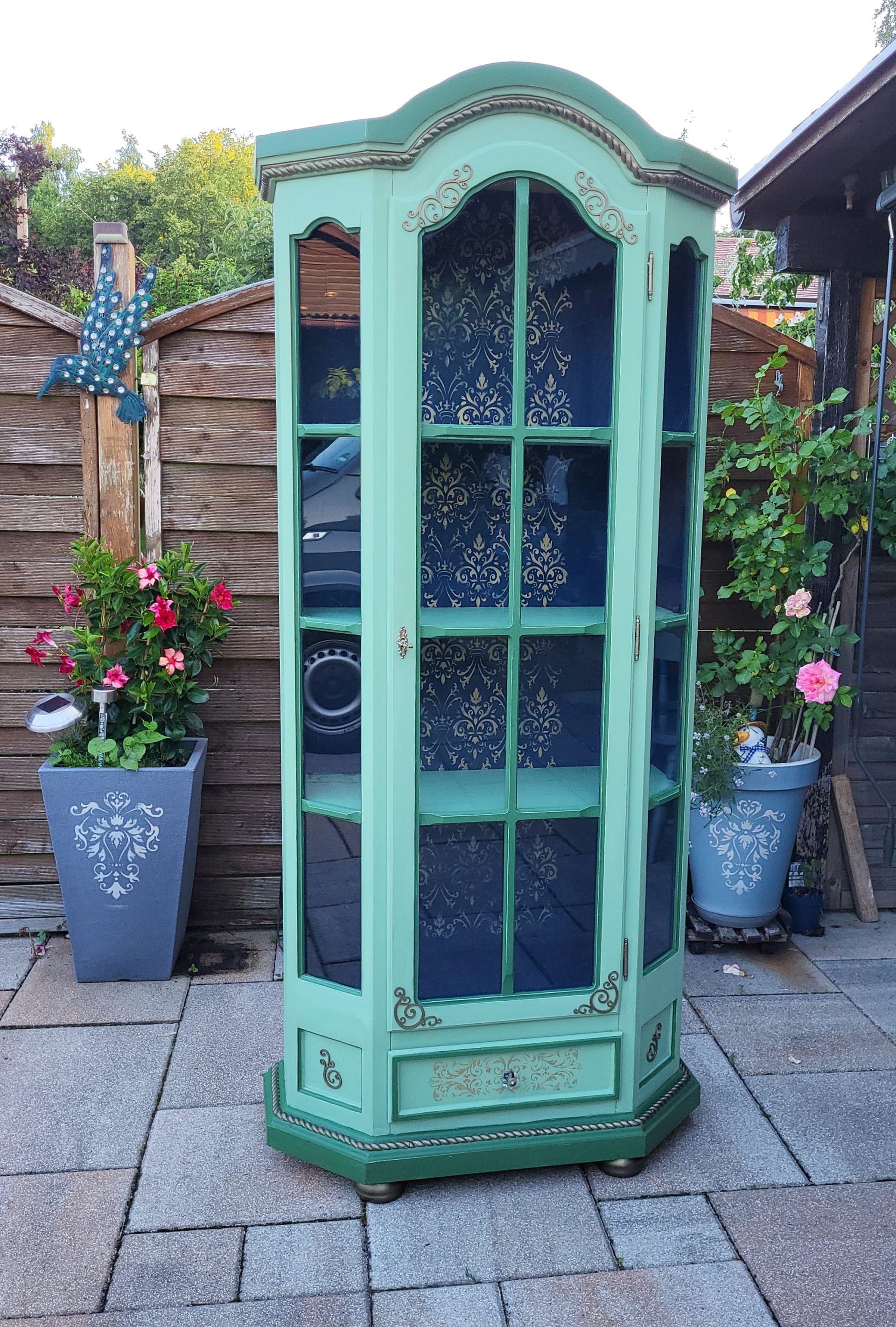 Ein Regalschrank mit verschiedenen Grüntönen, an den Ecken und Griffen ist in Rostoptik gearbeitet. Und mit Ornamenten versehen.