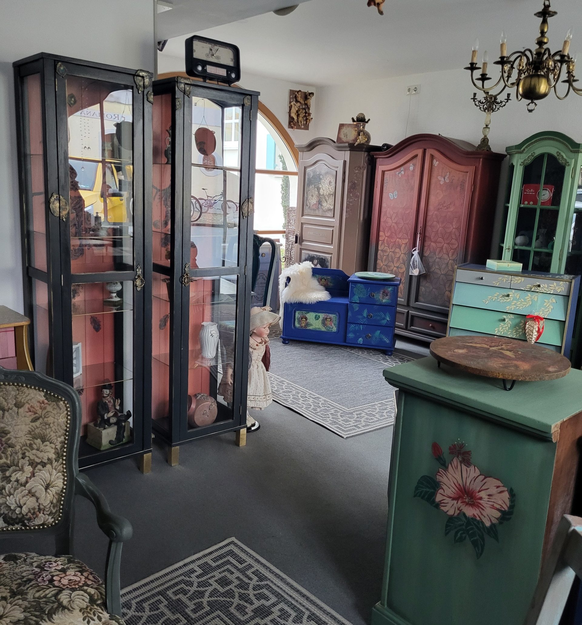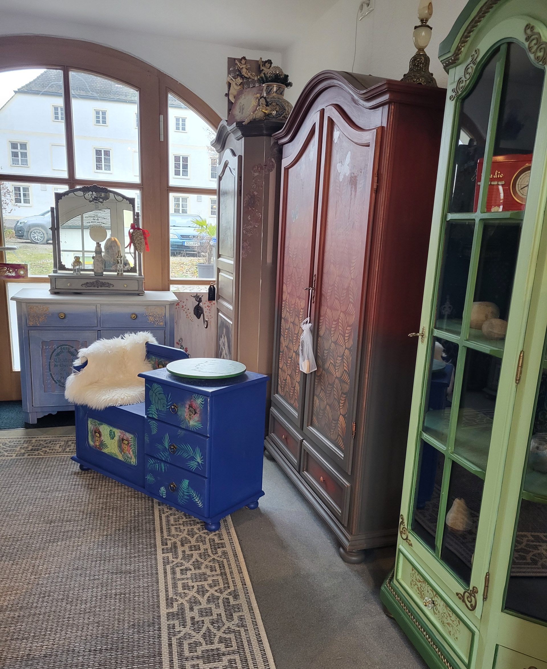 Im Herzen von Kühbach, direkt am Marktplatz, finden Sie meinen kleinen Showroom – ein Einblick in meine handgefertigten Werke. Ich arbeite ausschließlich mit umweltfreundlicher Kreidefarbe sowie hochwertigen Wachsen und Lacken zur Versiegelung.